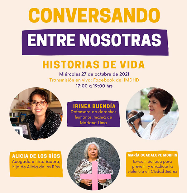 El primer conversatorio titulado “Historias de vida” tuvo lugar el 27 de octubre de 2021 y estuvieron presentes Alicia de los Ríos, Irinea Buendía y María Guadalupe Morfín. En este primer espacio se habló con mujeres que han hecho una diferencia con sus luchas, sus ideas y su amor transformador, compartieron sobre sus vidas, nos inspiraron y nos invitaron a dialogar colectivamente.