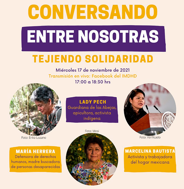 El segundo conversatorio, “Tejiendo solidaridad”, tuvo lugar el 17 de noviembre de 2021. Estuvieron conversando con nosotras María Herrera, Lady Pech y Marcelina Bautista. El tema central de este encuentro fue la colectividad, y como el caminar juntas nos hace más fuertes. Dialogamos con mujeres que han demostrado que una colectividad femenina es una gran fuente de inspiración.