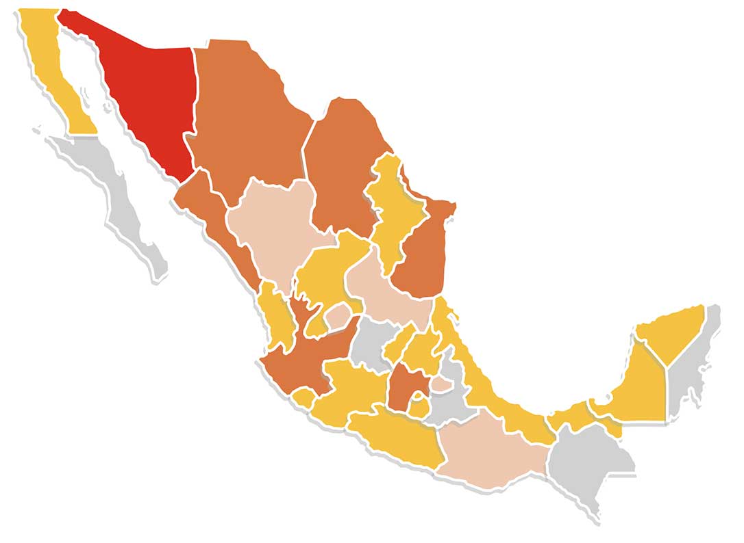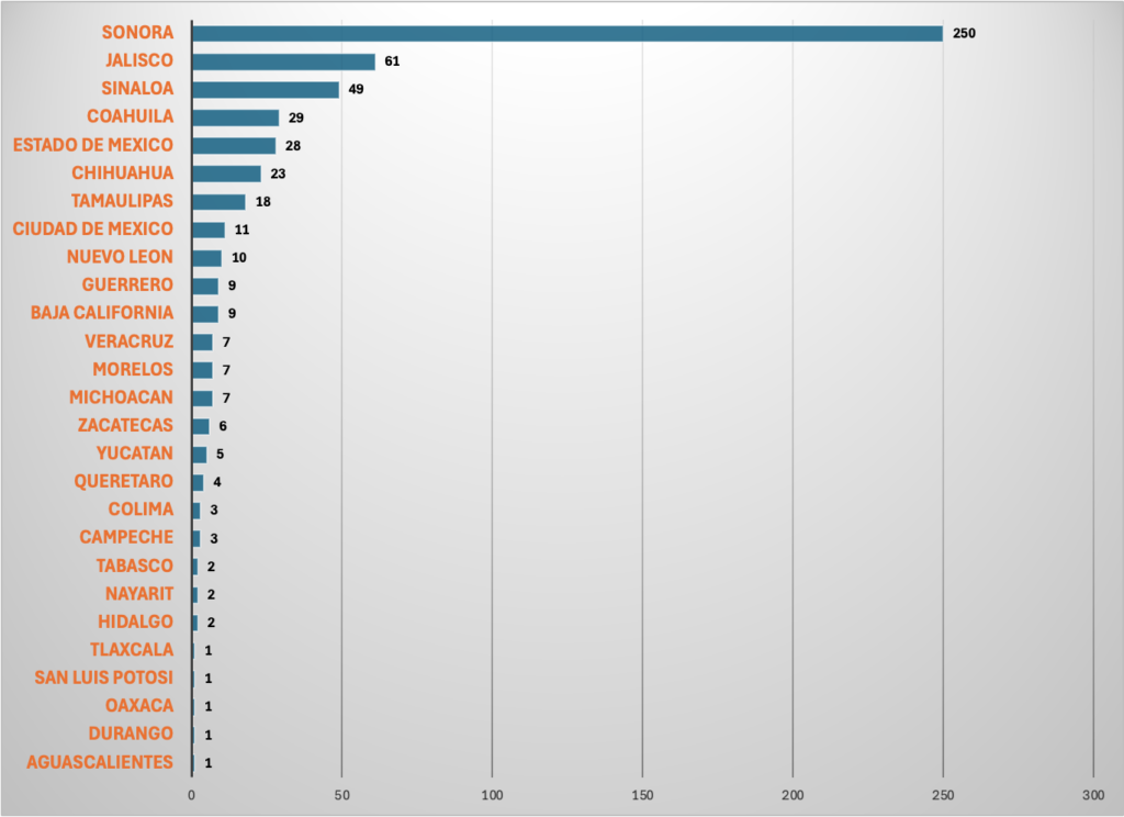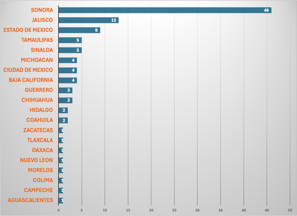 La dispersión de los casos por estados, donde se desconoce el grupo étnico y que son el mayor número registrado, nos muestra como Sonora, Jalisco, Sinaloa, Coahuila, Edomex, Chihuahua, Tamaulipas, Ciudad de México y Nuevo León reportan diez o más casos.