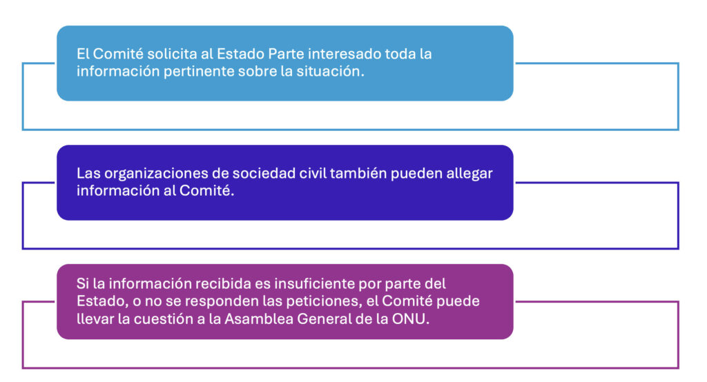 si el Comité recibe información que, a su juicio, contiene indicios bien fundados de que la desaparición forzada se practica de forma generalizada o sistemática en el territorio bajo la jurisdicción de un Estado Parte, y tras haber solicitado del Estado Parte interesado toda la información pertinente sobre esa situación, podrá llevar la cuestión, con carácter urgente, a la consideración de la Asamblea General de las Naciones Unidas, por medio del Secretario General de las Naciones Unidas. Ver en la página oficial.
